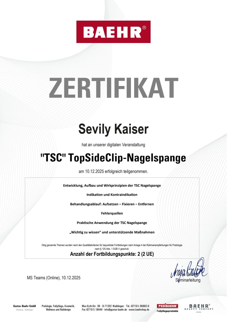 Teilnahmebestaetigung: TSC TopSideClip-Nagelspange