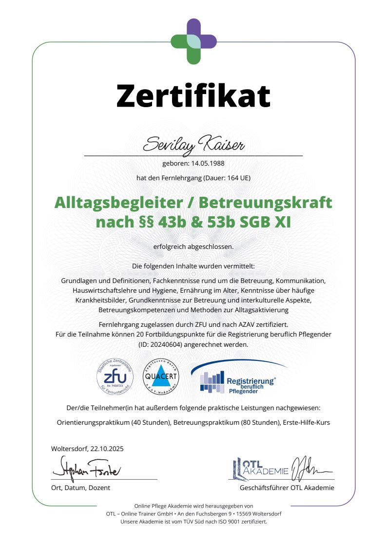 Zertifikat Alltagsbegleiter Betreuungskraft