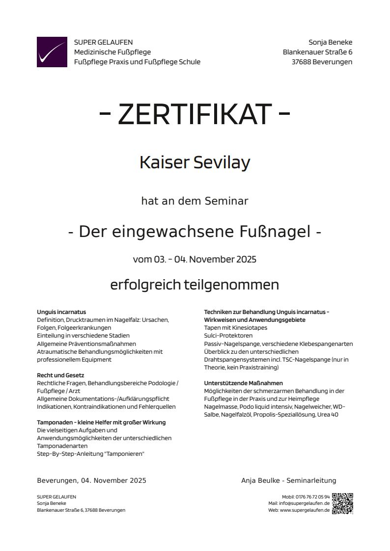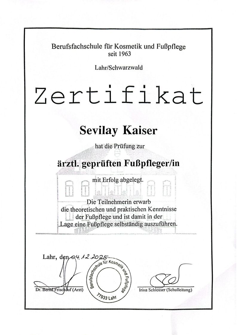 Zertifikat ärztl. geprüften Fußpfleger/in
